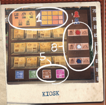 次に、ニュースカードをシャッフルし、オレンジ色の面を上に向けて、キオスクの指定されたエリアにデッキを形成します(1)。 カードを1枚めくって隣のスペースに置きます。 |