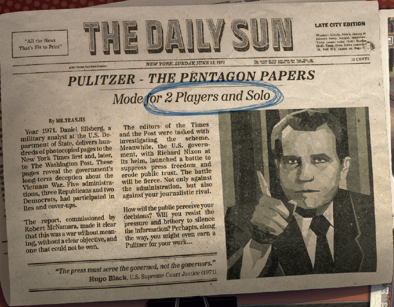第8ラウンドの終了後に、最高のレポート、名声(ゲーム中に獲得したポイント)、およびリーチを持つプレイヤーがピューリッツァー賞を受賞します。