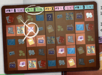 (A) 新聞の利用可能なスペース(指定された窓)にあなたのリクエスト1つを配置します。 (B) あなたのジャーナリスト1人をキオスク(売場に並んでいるそれぞれの新聞の上)、書庫、バス、または残業(それぞれの窓の上)の空きスペースに裏向きに配置します。配置されたジャーナリストの値を見ることも、交換することもできません。 (C) パス(ジャーナリストが残っていない場合は必須です)。 |
