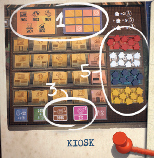 2つの「+2」トークンをキオスクの指定された場所に置き(3)、新聞の異なるセクションにそれぞれ対応するトークンを指定された場所に置きます(4)。 |