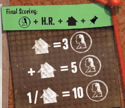 さらに、各色の家を最も多く持っているプレイヤーは5ポイントを受け取り(同数の場合は誰も得点しません)、異なる色の家が4つ(または3人用ゲームの場合は3つ) のセットごとに10ポイントを獲得します。