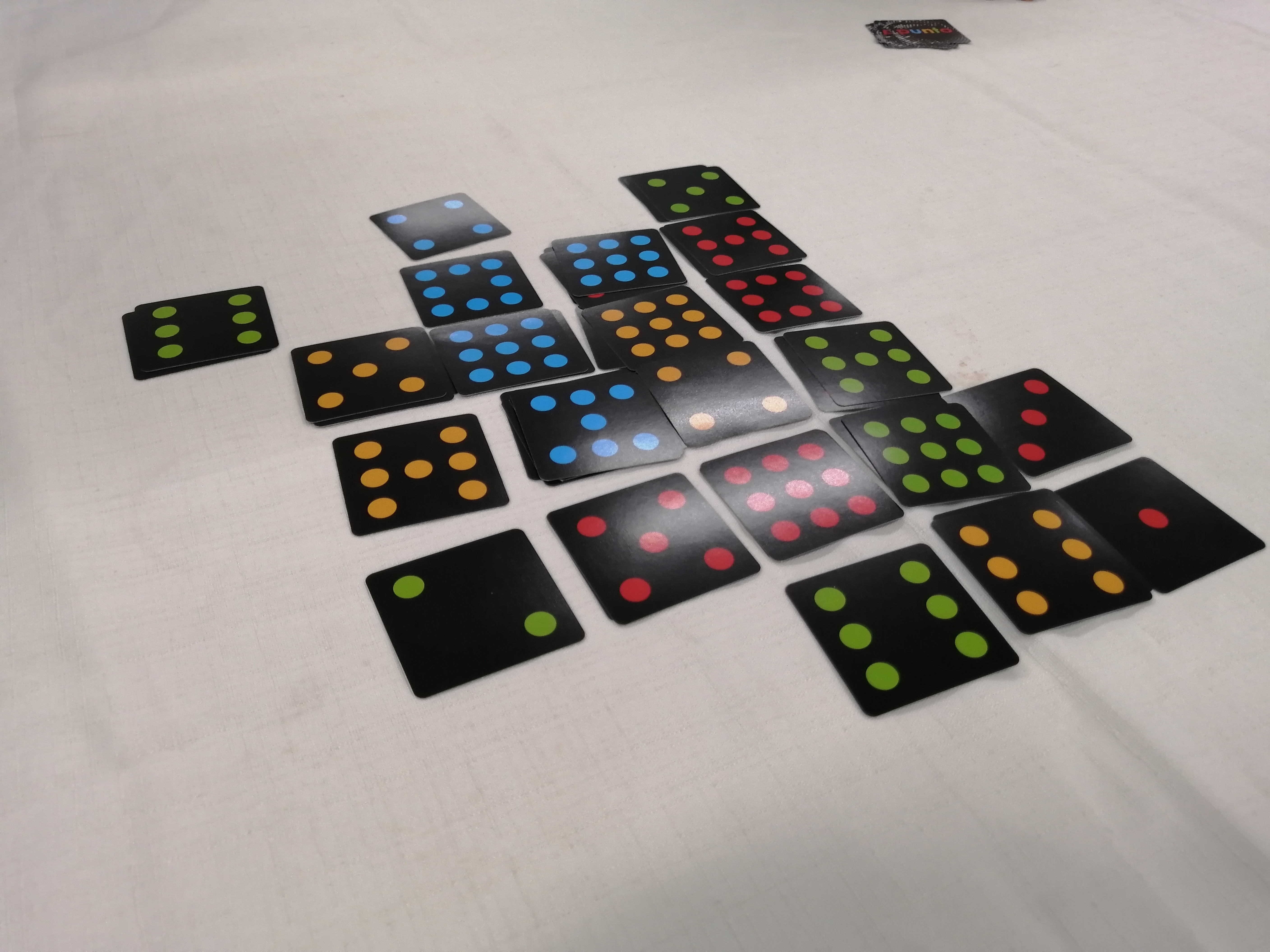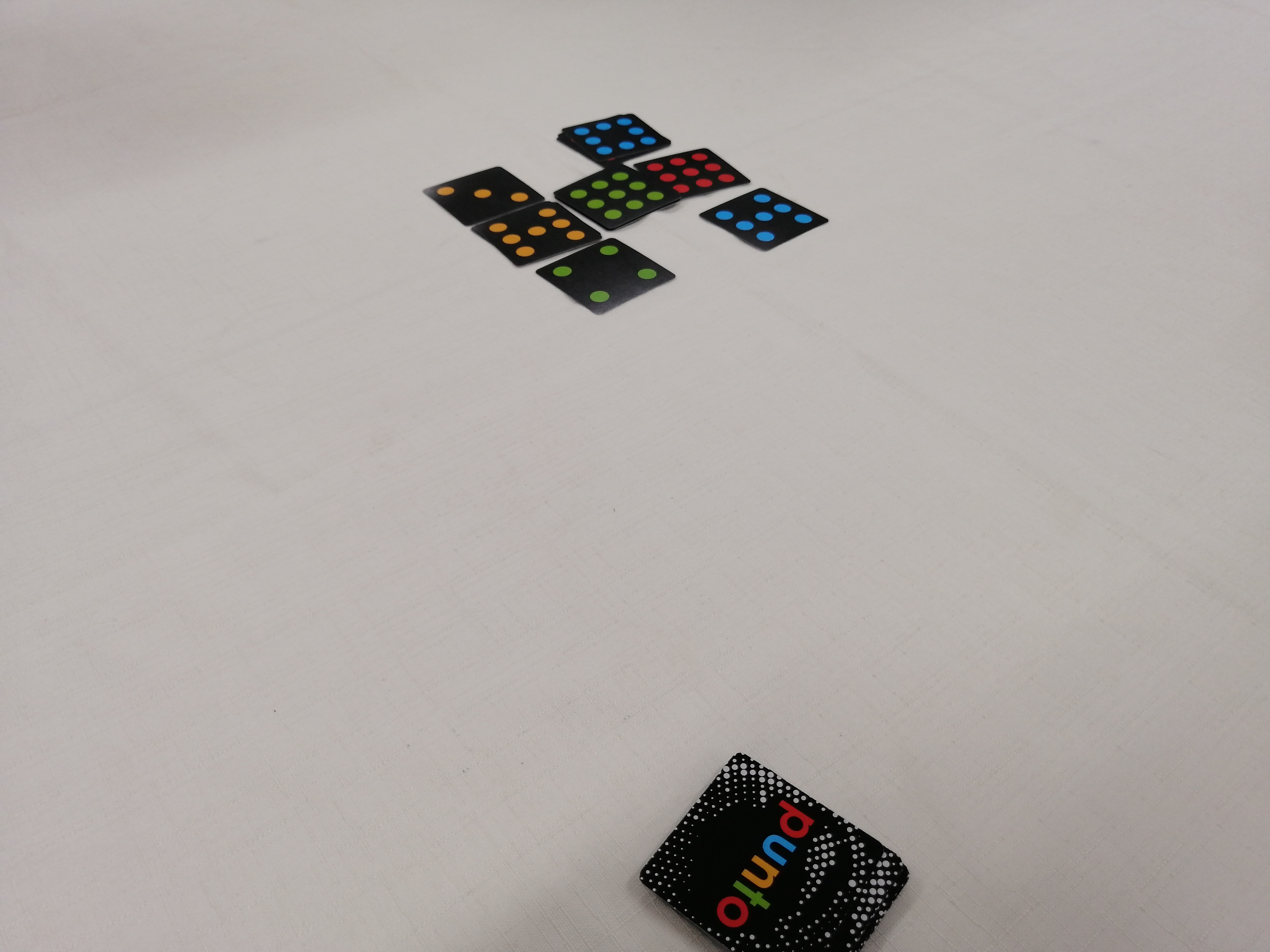 各プレイヤーは同じ色の1〜9の点字カードを各2枚受け取り、しっかりとシャッフルして山札にします。手番になりましたら山札から1枚のカードをめくりカードに隣接するように配置するか、めくったカードより小さいカードの上に重ねて配置することができます。