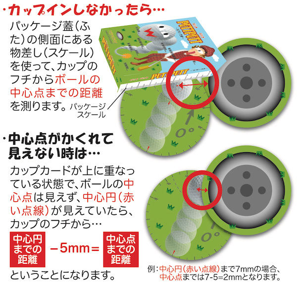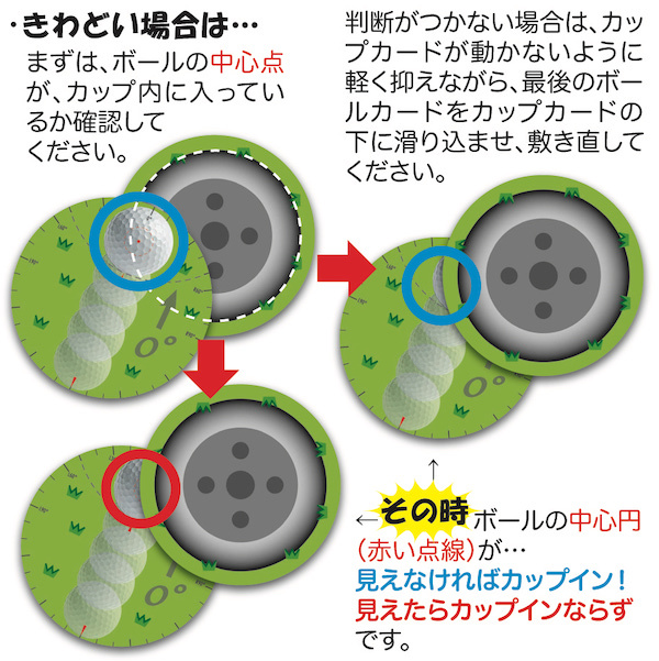※ボールの中心円(赤い点線)が見えなければ、中心点はカップ内に入っていることになります。