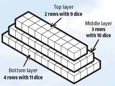 最上層 9つのダイスが2行 中間層 10個のダイスが3行 最下層 11個のダイスが4行 |
