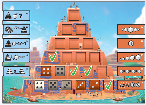 ピラミッドの各レベルについて、すべてのダイスが目標トークンの要件を満たしているかどうかを確認します(各トークンの詳細については、トークンリファレンスシートを参照してください)。
