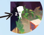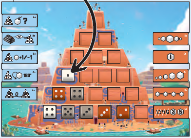 ステップ 2 彼らはピラミッドのダイスにただちにスキルを使用します。彼らは180°回転するレベル1にあるダイスを選択します。値は2から5に変化するため、目標トークンC6 で示されるそのレベルの目標を満たします。この場合、レベル1で3または5の値のダイスのみを持ちます。 |