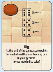 大きい ゲーム終了時に、ピラミッドの値4、5、または6のダイスごとにポイントを獲得します(ディスクの色に一致する必要があります)。 |