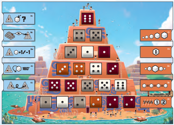 すべてのピラミッドが完成すると(ダイスが21個配置される)、ゲームは終了します。