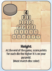高さ ゲーム終了時に、ダイスごとに、ピラミッドの上のレベルにあるほど多くのポイントを獲得します(ディスクの色に一致する必要があります)。 |