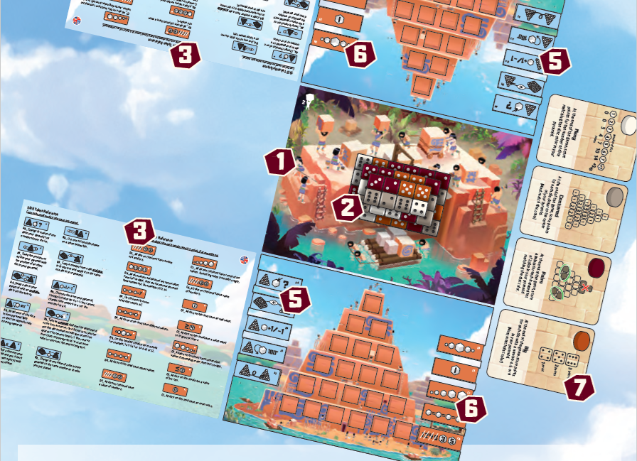 3) 各プレイヤーは、ピラミッドボード1枚とトークンリファレンスシート1枚を前に置きます。