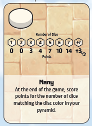多い ゲーム終了時に、ディスクの色に一致するピラミッドのダイスの数に応じてポイントを獲得します。 |