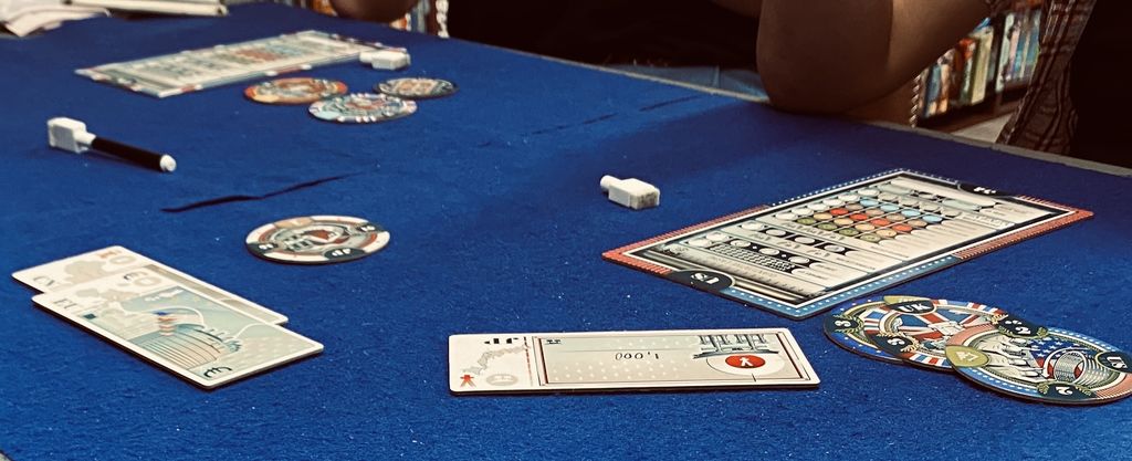 各プレイヤーがJAPAN、アメリカなどの国を担当して農場や工業などのタイルを集めていくゲームになります。このタイルを手に入れる方法が特徴的で使える金額に制限がありません。1億でも100兆でも好きな金額を書くことができます。ただし最後の得点計算で一番資金を使ったプレイヤーは無条件で脱落になってしまいます。