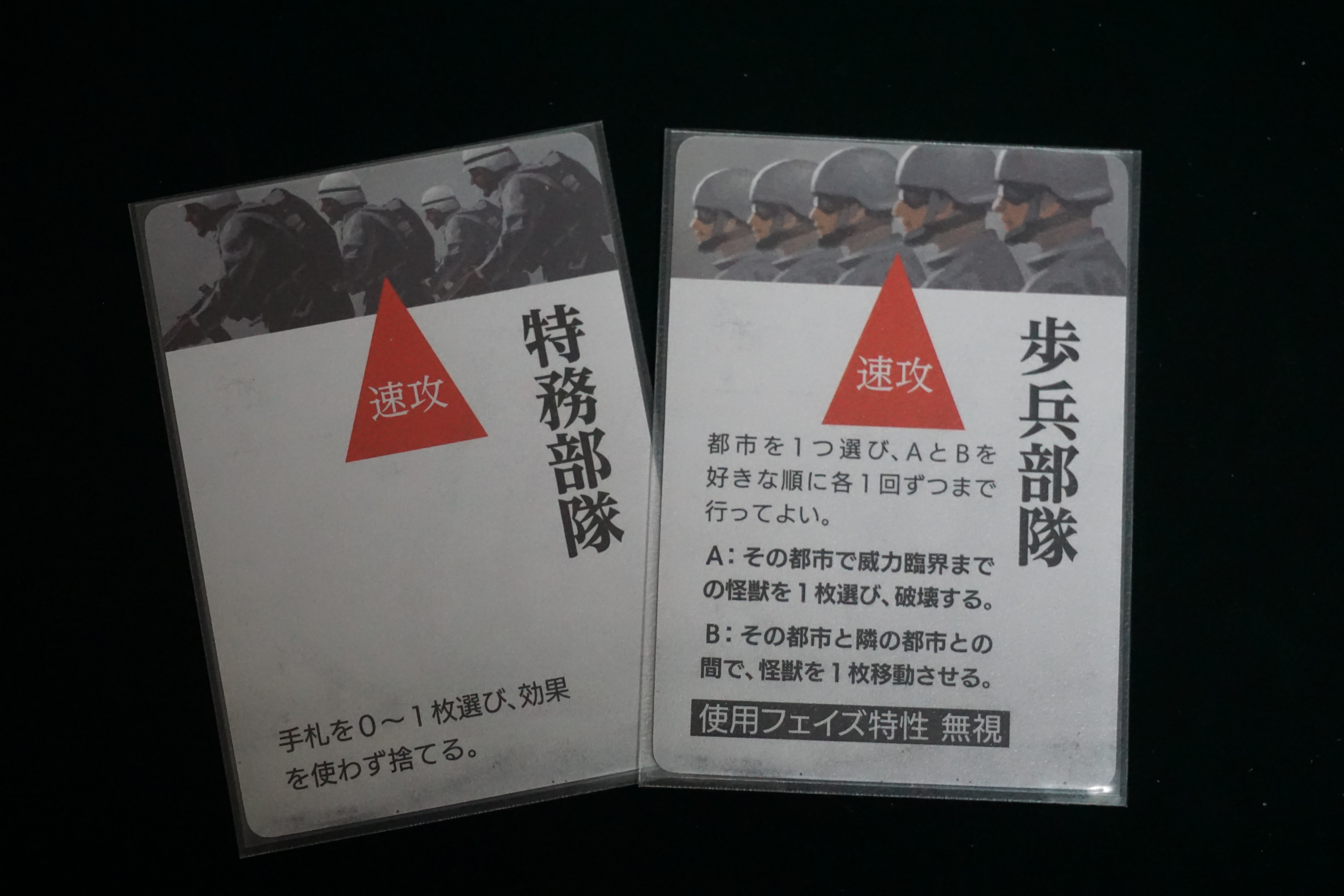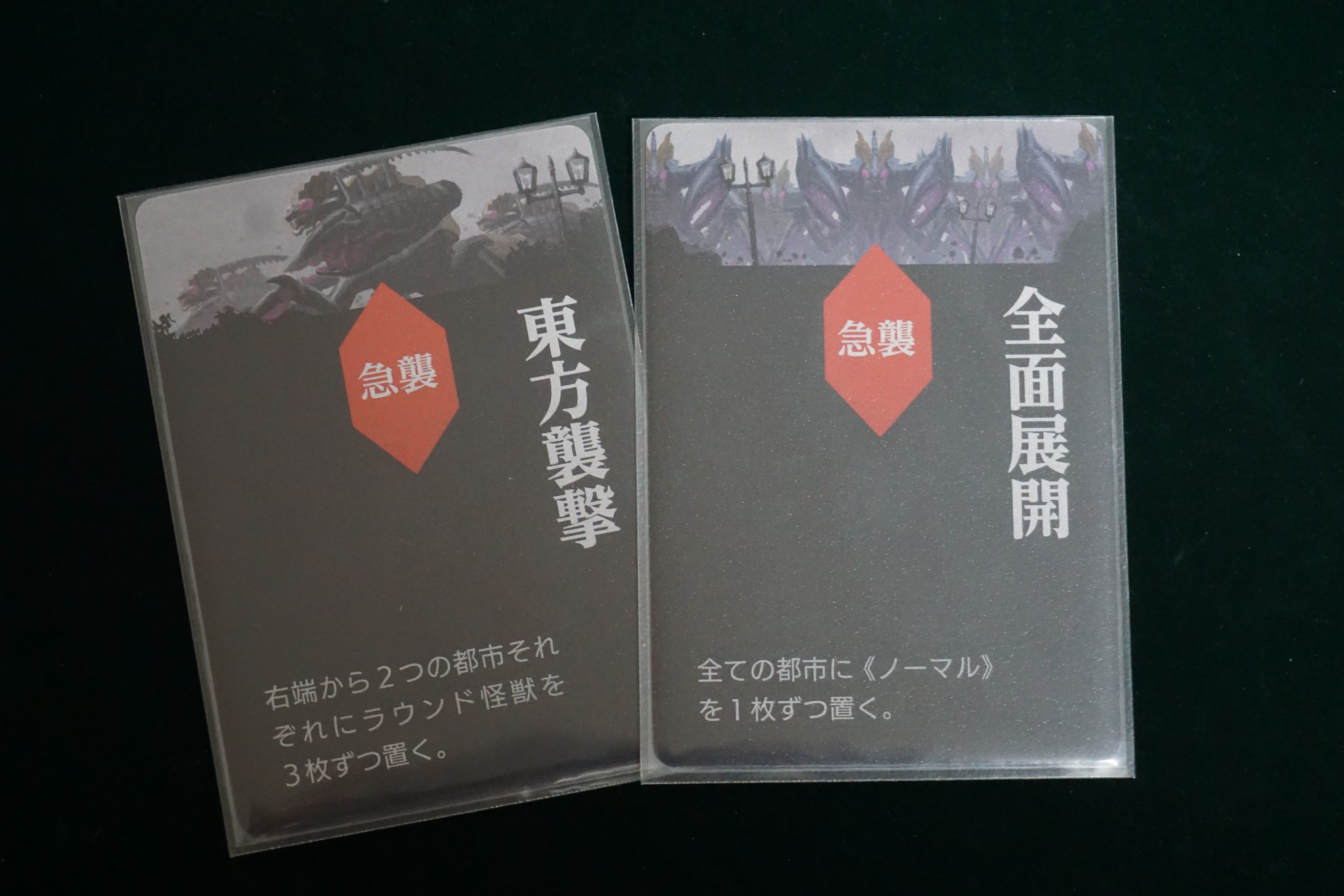 通常のイベントカードに加え怪獣の予測不能な進撃を表す「急襲」カードと急襲に対する人類の作戦行動である「速攻」カードや他カードの効果をコピーできる「特殊」カードが含まれており、急襲カードは優先的に処理しなければならないため不測の事態に慌てずに対応できるように戦略を練る必要があります。