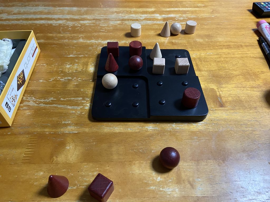これだけだと簡単なように思えるけど、もう一つのルールとして「相手が置いたコマと同じ形のコマは縦、横・エリアには置けない」というものがある。つまり相手が四角のコマを置いた場合、自分は相手のコマの延長線上およびエリアに四角のコマを置けなくなります。