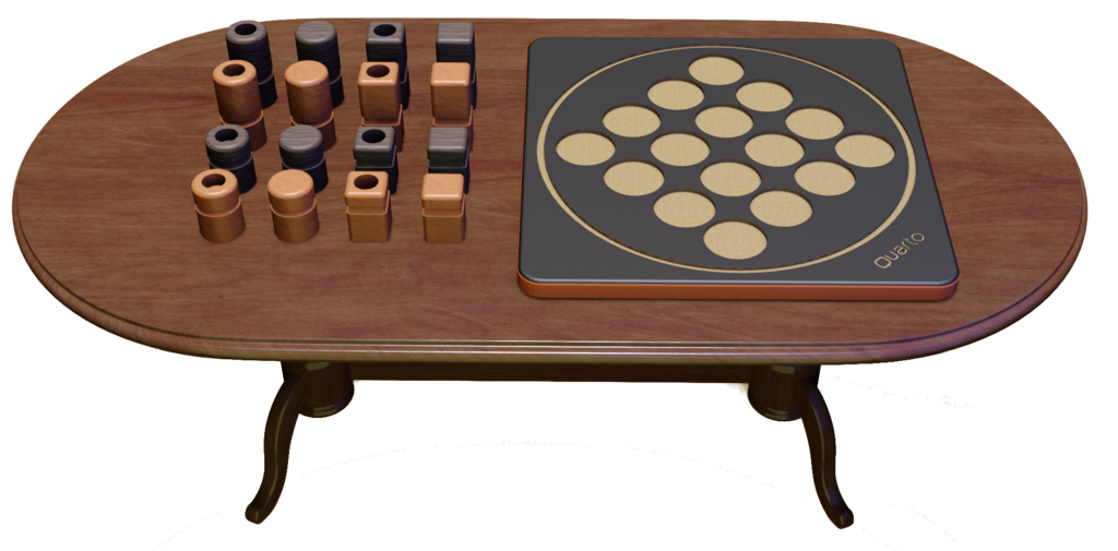 4種類の特徴(①白 or 黒、②丸 or 四角、③穴有り or 穴無し、④低い or 高い)を有したコマが合計16個あります。その4種類の特徴のいずれかを揃えるよう相手と戦うゲームです。コマの見た目がおしゃれでモチベーション上がりますね。