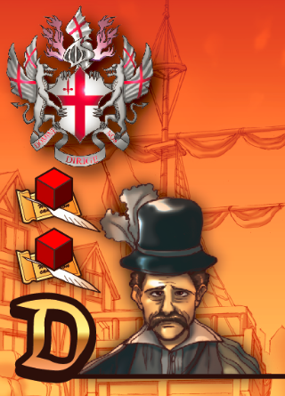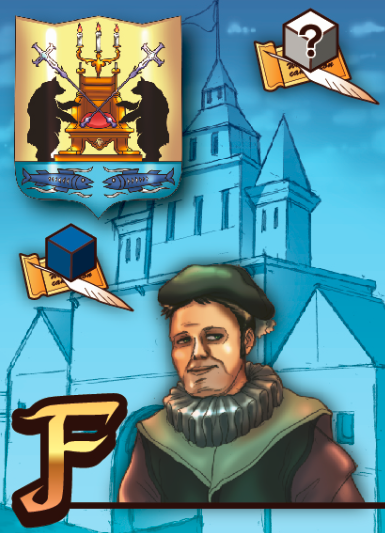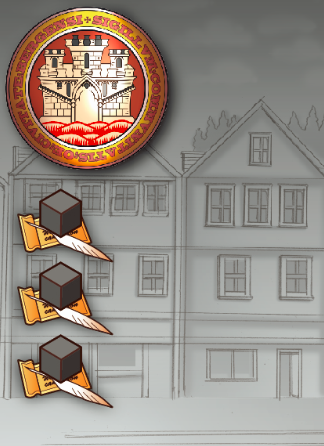 →裏向きに出したカードは、リューベクへの貢献と見なします。裏向きのカードをすべて公開し、それらの交渉力アイコンの合計値を比べます。どの都市のカードかは関係ありません。各都市の繁栄トラック1位の収入を参照し、