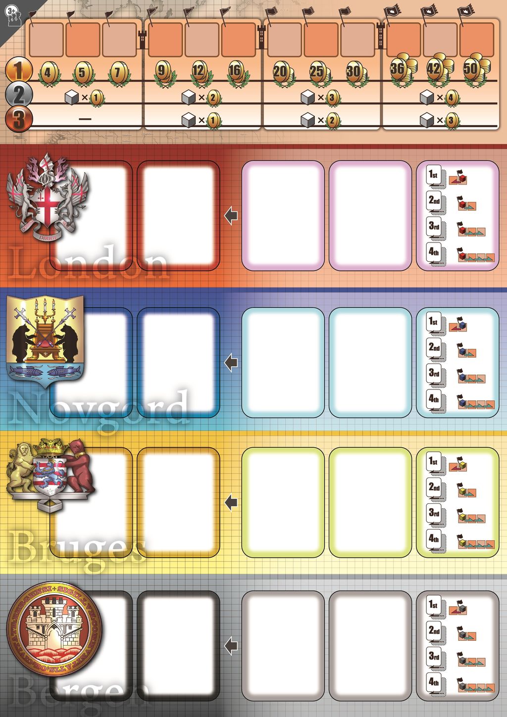 ゲームシステムは、カードプレイによるマジョリティです。各カードは4つの同盟都市(ロンドン・ブリュージュ・ベルゲン・ノヴゴロド)いずれかに対応しており、1~3個の交渉力アイコンが付いています(カード左側のキューブアイコン)。プレイヤーは、都市ごとにその交渉力の合計値を競います。