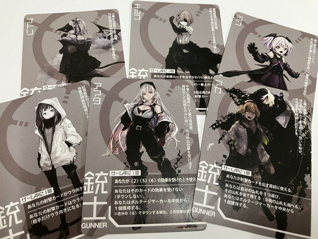 ↓まず、今ふうのイラストで描かれた女の子(とても銃を扱えるようには見えない)が6枚。全員何かしらの《特殊効果》を持っていて、ゲーム中1回だけ使えます。これを1枚選んで《自分》となります。