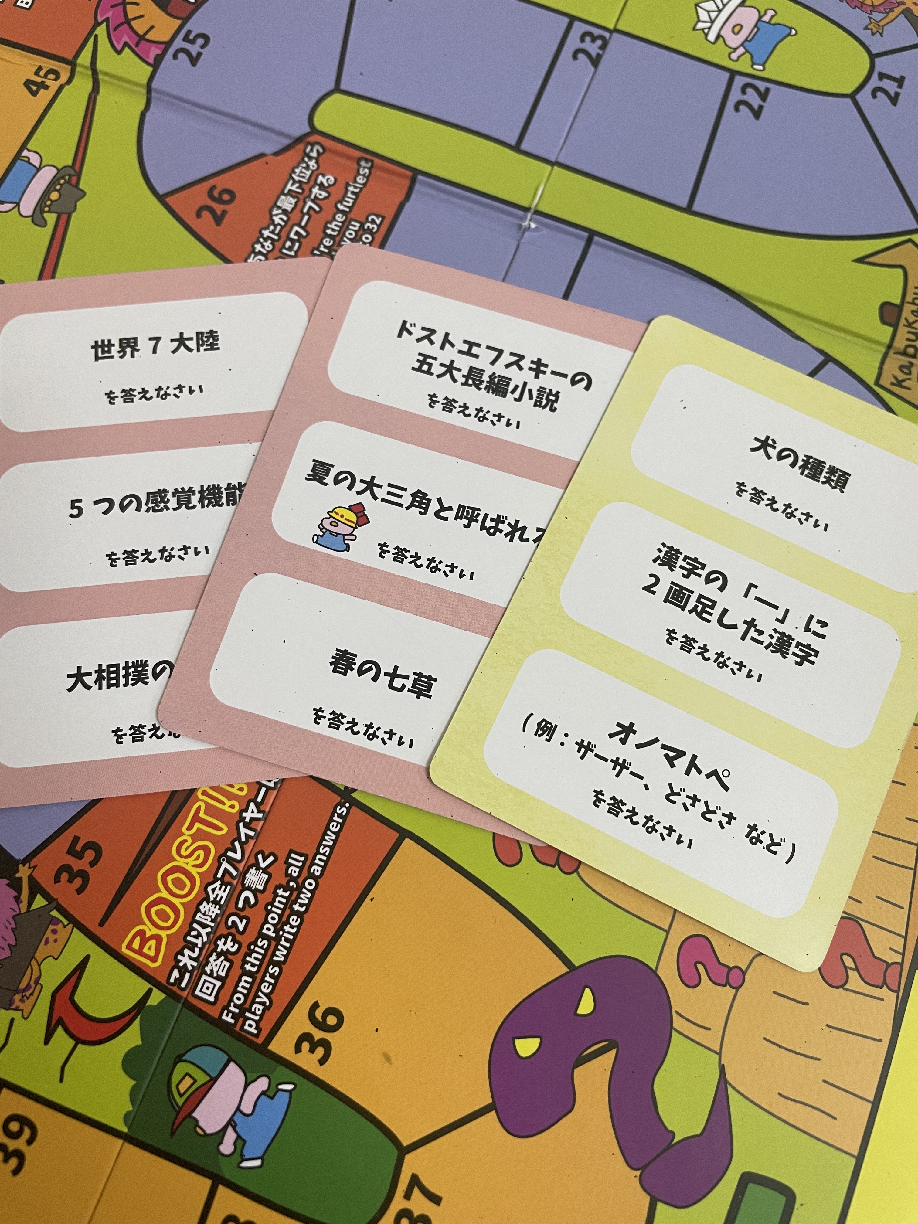 ゲーム内容的には簡単なクイズに答えて、答えが被るか被らないかで進めるか進めないかが決まるすごろく。絶対被らないでしょ!と思ったワードを全員が書いてて爆笑してたり、こんなん被るやろ!と言いながらめくったら全員違う答えで謎の感動がうまれたりする。かなり面白いです。