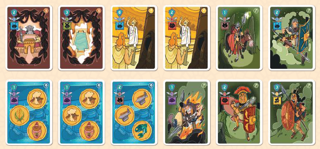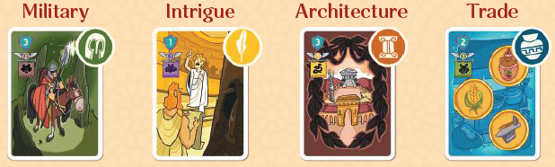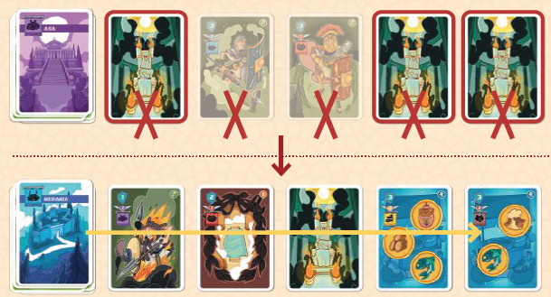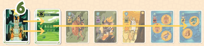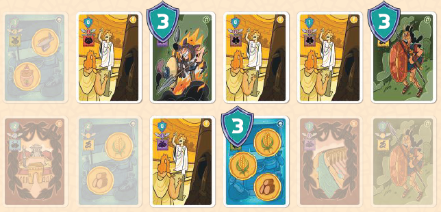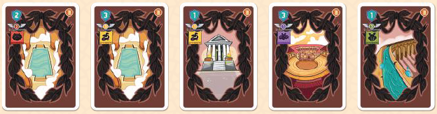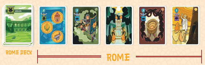 プレイヤーはローマのカードの中から1枚を選び、それを手札に加えます。次に、残されたギャップを、デッキの次のカードを使用して埋めます。神カードの場合は、(神が見えないように)裏向きに置かれます。それ以外の場合は、表向きに配置されます。