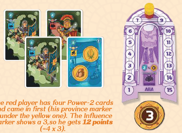 各プレイヤーは、影響力トークンからの自分の値に、目の前にある特定の種類(これは属州ごとに異なります)のカードの枚数を掛けます。各属州の値は、次のように決定されます。