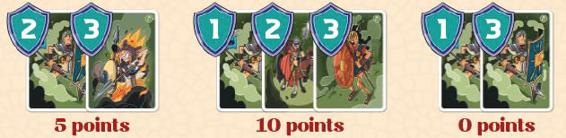 - 1、2、3のパワーを持つ軍事カードのグループ(3枚)ごとに、プレイヤーに10ポイントを付与されます。