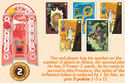 赤プレイヤーは、アフリカのスペース5にマーカーを置いており、2位になっています。彼はパワー1カードを5枚持っています。彼がこの属州で2位になったため、彼の影響力トークンの値は1減少しており、彼は5ポイント(= 5 x 1)を獲得します。 |