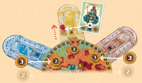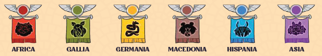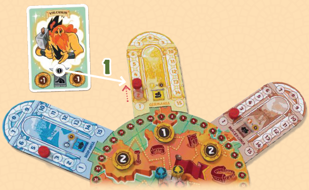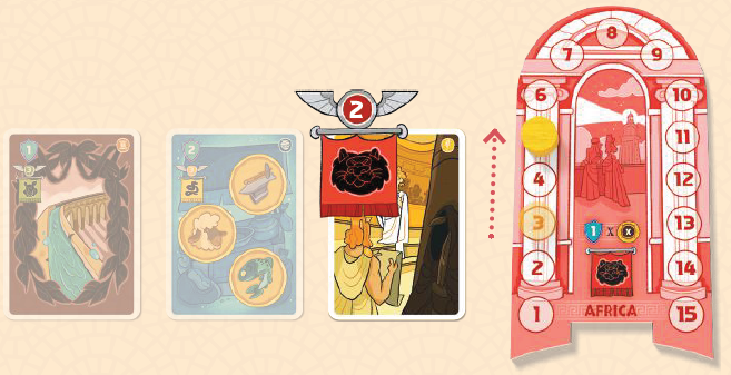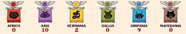 その後、プレイヤーはカードに旗で示されている通りに、該当する属州にある自分の属州マーカーをそのスペース数だけ進めます。他のプレイヤーのマーカーと同じスペースに到着した場合、動かしたマーカーが上に配置されます。 |