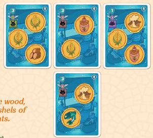 このプレイヤーは、魚1、木1、羊2、ワイン2、小麦4を集めることができ、合計10ポイント(=0+0+2+2+6)を獲得しました。 |