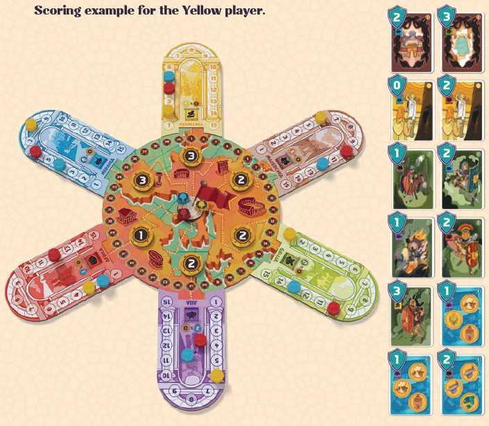 各属州とカードタイプのスコアを合計すると、プレイヤーは獲得したポイントを示すスコアマーカーを使用して勝利ポイントトラックに沿って進みます。誰かが40ポイントを超えた場合はいつでも、そのスコアマーカーを裏返して「+40」面を示すようにします。最後に最も多くのポイントを獲得した人が勝者です。同点の場合は、すべての属州の合計で最も影響力のある者が勝ちます。それでも同数の場合は、それらのプレイヤーが共同でローマを統治します。