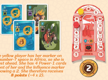 黄プレイヤーは、アフリカのスペース7にマーカーを置いているので、彼女は最も前方にいます。彼女の前にはパワー1のカードが4枚あり、影響力マーカーは「2」を示しています。したがって、彼女は8ポイント(= 4 x 2)を受け取ります。 |