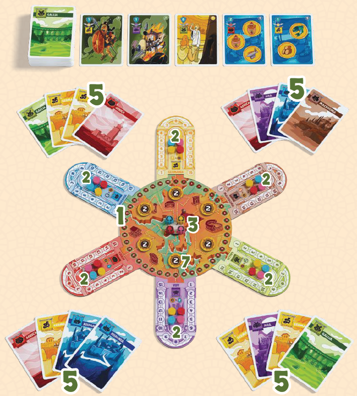 1) 中央のマップボードをテーブルの上に置き、その周りに6つの属州ボードをランダムに配置して、スペースに収まるようにします。