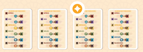 色付きの旗は、カードがどの属州に属しているか、またその属州での影響力の値を示しています。各カードが影響を与えることができる属州は、裏面にも示されています。すべてのプレイヤーは、他のプレイヤーの手札にあるカードの裏面を見て、そのプレイヤーがどの州で影響力を行使できるかを知ることができるように、裏面が他のプレイヤーに見えるようにしなければなりません。