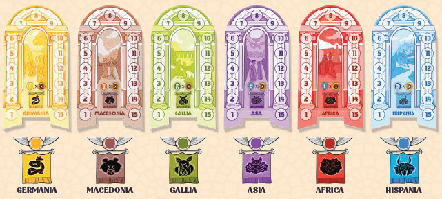 2) 各プレイヤーに色を割り当て、各属州の0スペース(数字の1スペースの隣)にプレイヤーの色ごとに1つの属州マーカーを配置します。使用しない色のマーカーはボックスに入れたままにしておきます。