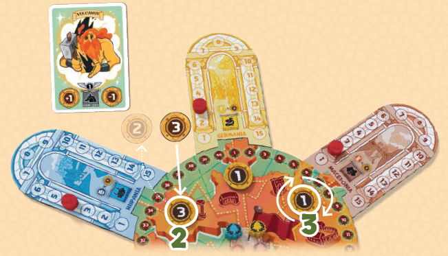 2位のプレイヤーはその値から1を引く必要があり、値が0に減少するか、その属州にプレイヤーがいなくなるまで、この操作を繰り返します。順位が同点の場合、属州マーカーが下にあるプレイヤーがより前方にいるとみなされます。属州でスコアを獲得するには、プレイヤーはそのトラック上で少なくとも1スペース前進している必要があります。