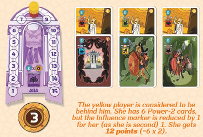 黄プレイヤーは赤の後ろにいると見なされます。彼女はパワー2のカードを6枚持っていますが、影響力トークンは(彼女が2位なので)1減ります。彼女は12ポイント(= 6 x 2)を獲得します。 |