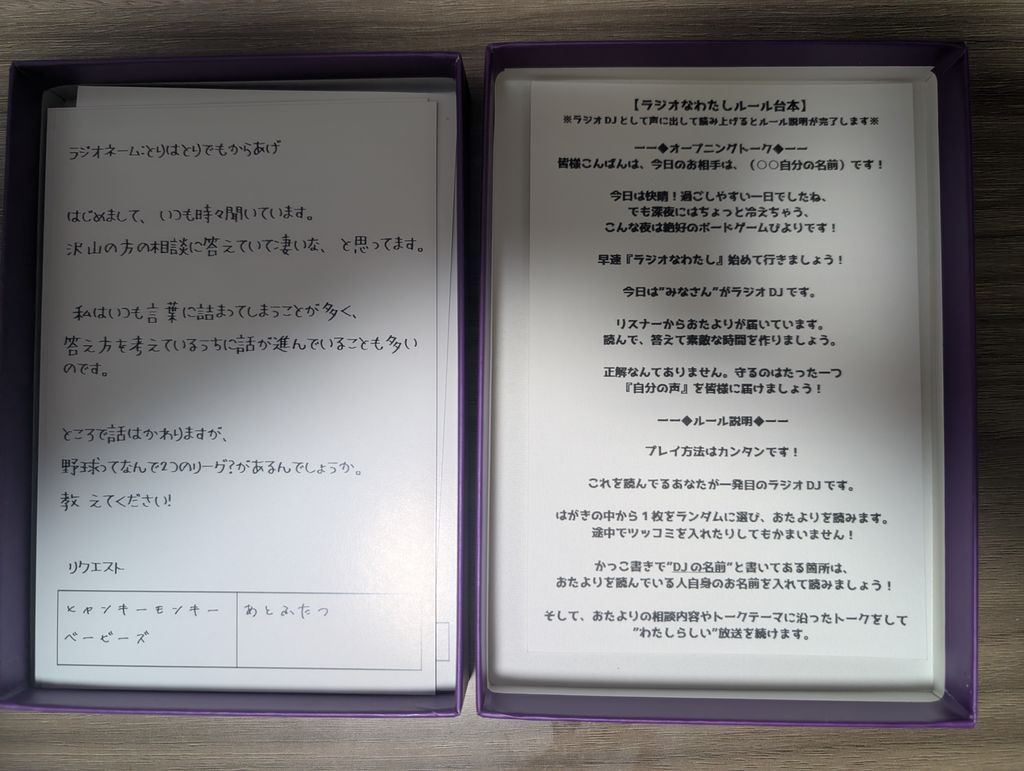 ラジオを聴いて過ごした時期のある方はその頃を懐かしんでトークも膨らみますし、ラジオを一度も聴いたことがない方は興味を持つきっかけになりえるんじゃないかな?と思うくらい魅力に満ちた雰囲気ゲームです。この作品が好きな方はスタンドマイクやオンエアーの看板など小道具も欲しくなってくるのではないでしょうか。