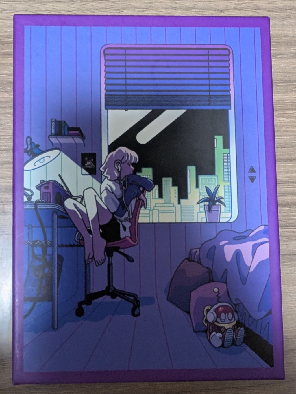 ラジオを置いた机の前に座る少女。静かな夜を連想させてくれます。