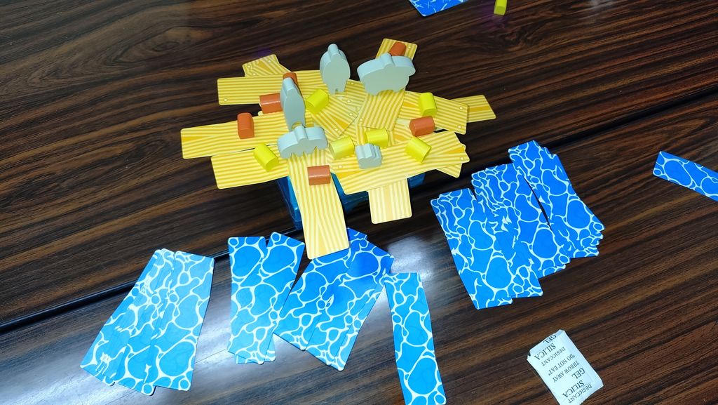 ルールは簡単で、毎ターンいかだの厚紙を台に載せて、人と宝箱の場所を変えていきます。