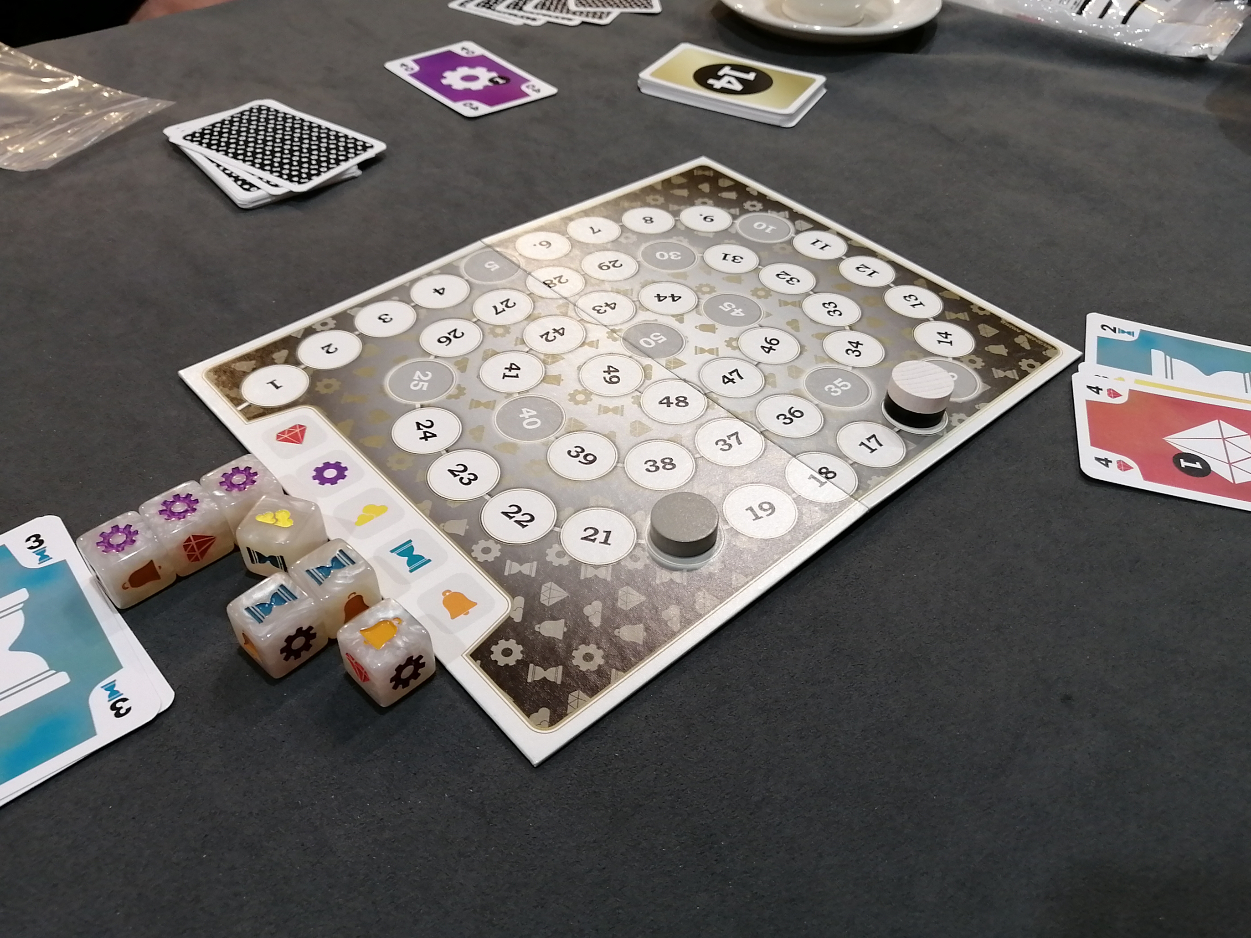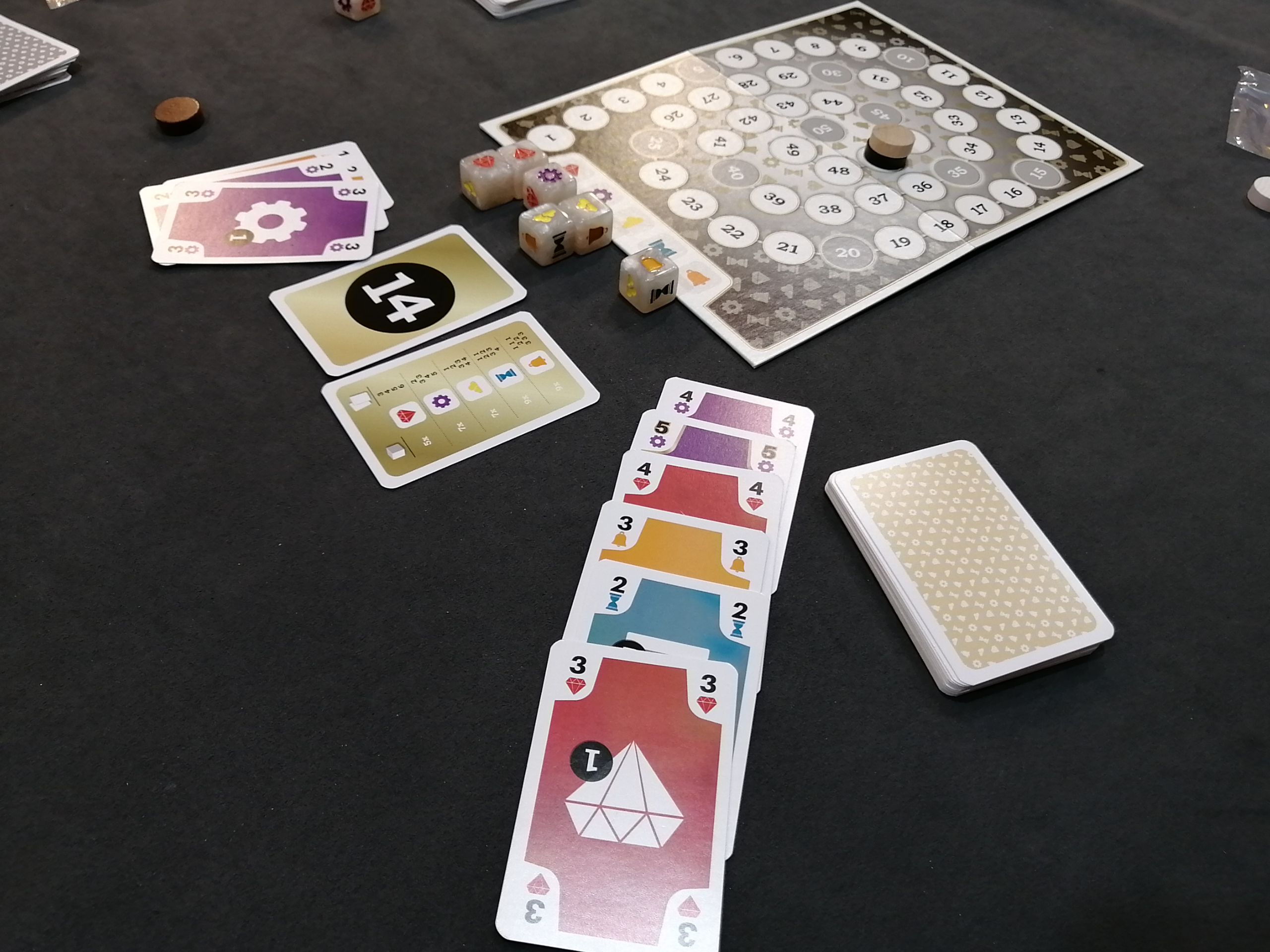 コマがどれぐらい進むかは、ラウンド開始時に振ったダイスのアイコンとカードプレイ時の数字のかけ算によります。ラウンド開始時だけは裏向きに1枚を選んでから一斉に公開して駒を進めて、以降は一番進んでないプレイヤーがカードをプレイしていく。