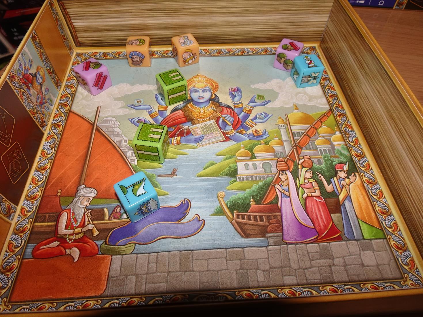 ソロヴァリアントでは仮想プレイヤーは箱のラクシュミ(青い神様)の頭部に近いダイスを優先的にドラフトする