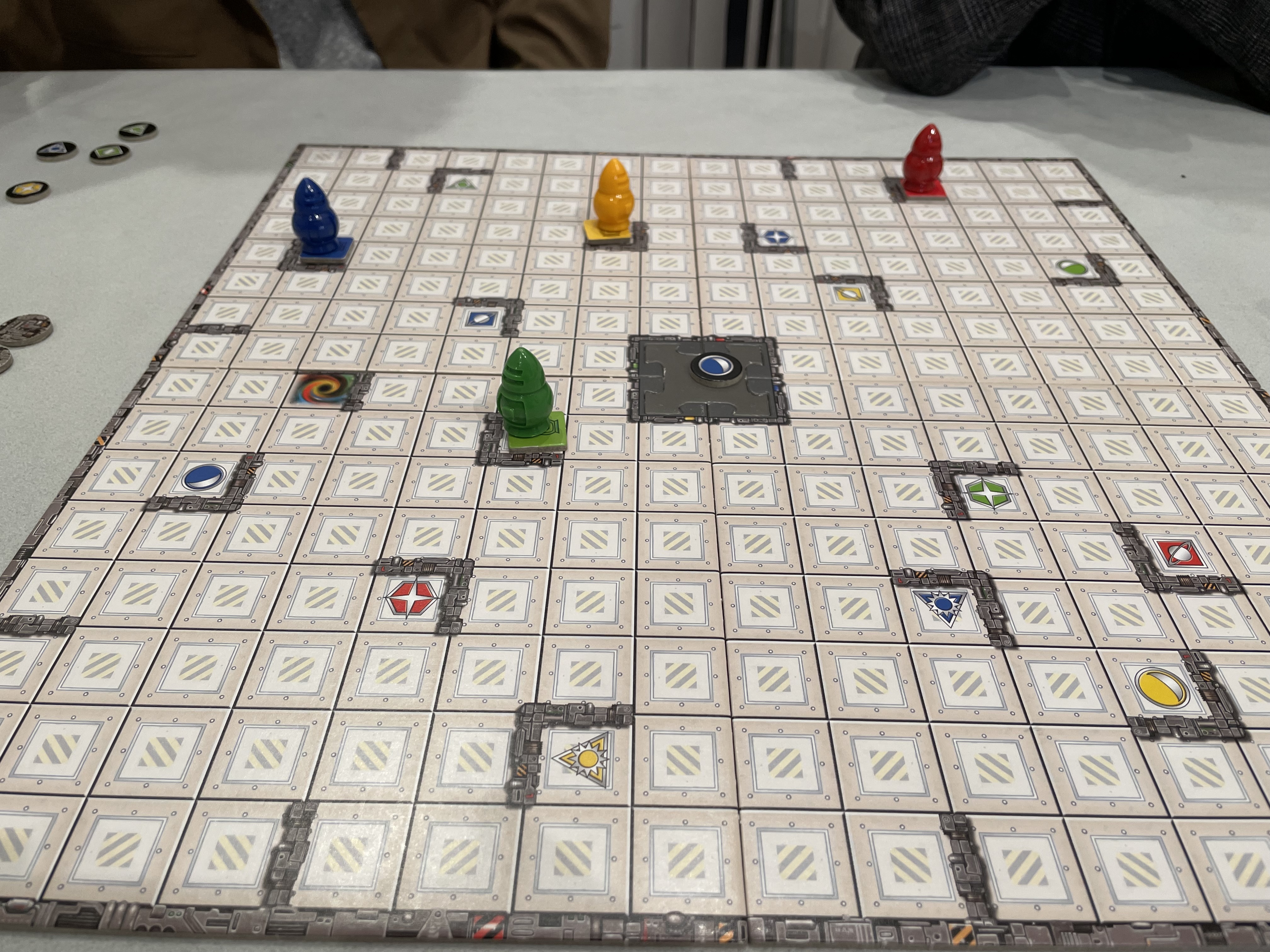 4人で遊びました。直線で動くロボットが目的地まで最短何回で到達出来るかを考えるゲームです。