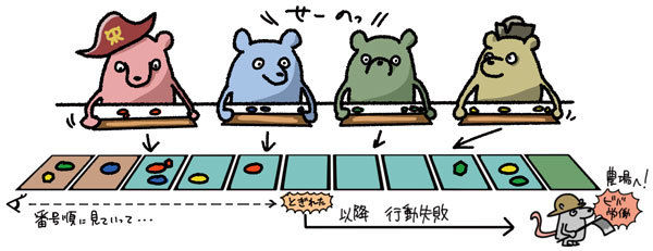 それぞれのコマをエリアタイルに置き、エリア番号順に見ていって、コマのあるタイルが連続していればいいけれど、途切れてしまったらそれ以降のタイルに乗っているコマは行動失敗。