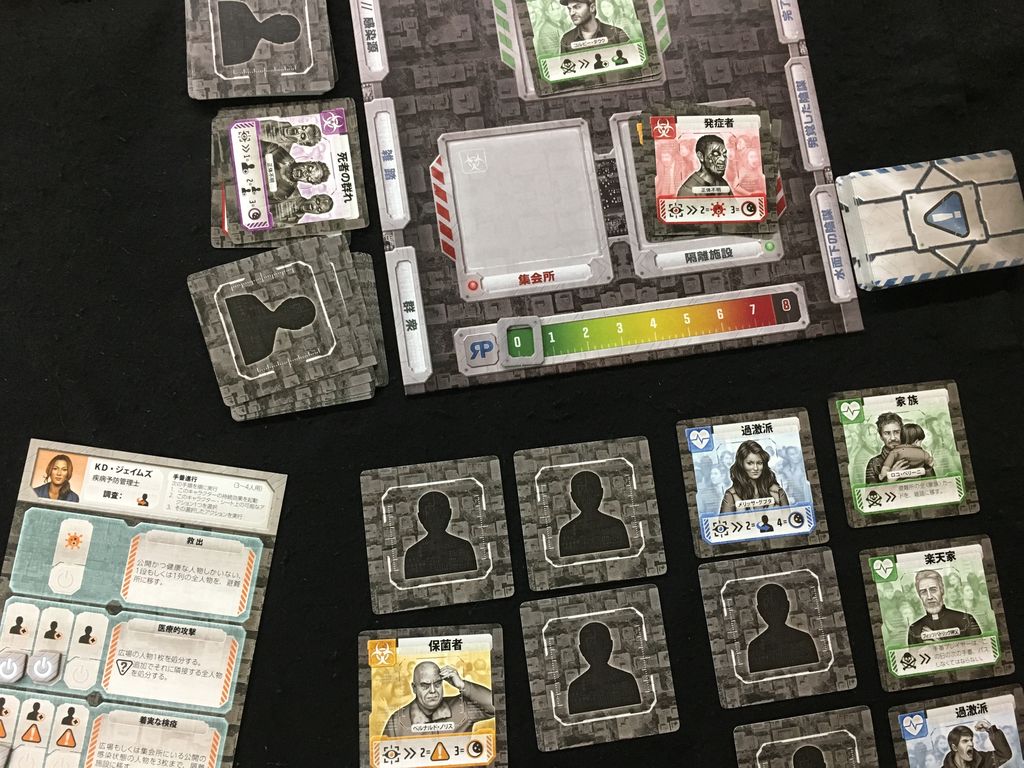 すべて個別に名前とイラストの付いた大量の《人物カード》を伏せて並べ、《調査》によって次々に身元を明らかにしていき、健康な人物だったら保護し、感染者だったら隔離するか《空爆》!!によって処分していきます。(いや、本当に空爆攻撃です。英文ルール調べても本当に《Air Strike》って書いてあります。