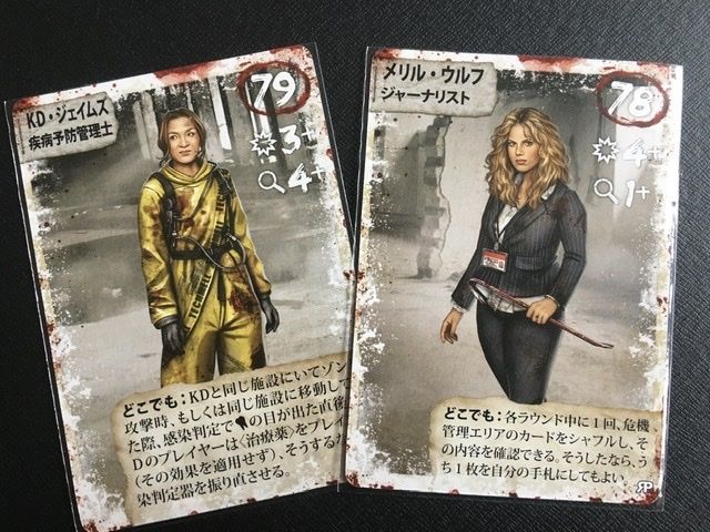 このゲームセットには、デッドオブウィンターにそのまま使える新キャラクター(しっかり専用のクロスロードカードも付いてる)が付属しています。(このゲームのキャラシートにあった女性ジャーナリストと、女性疾病予防管理官です)