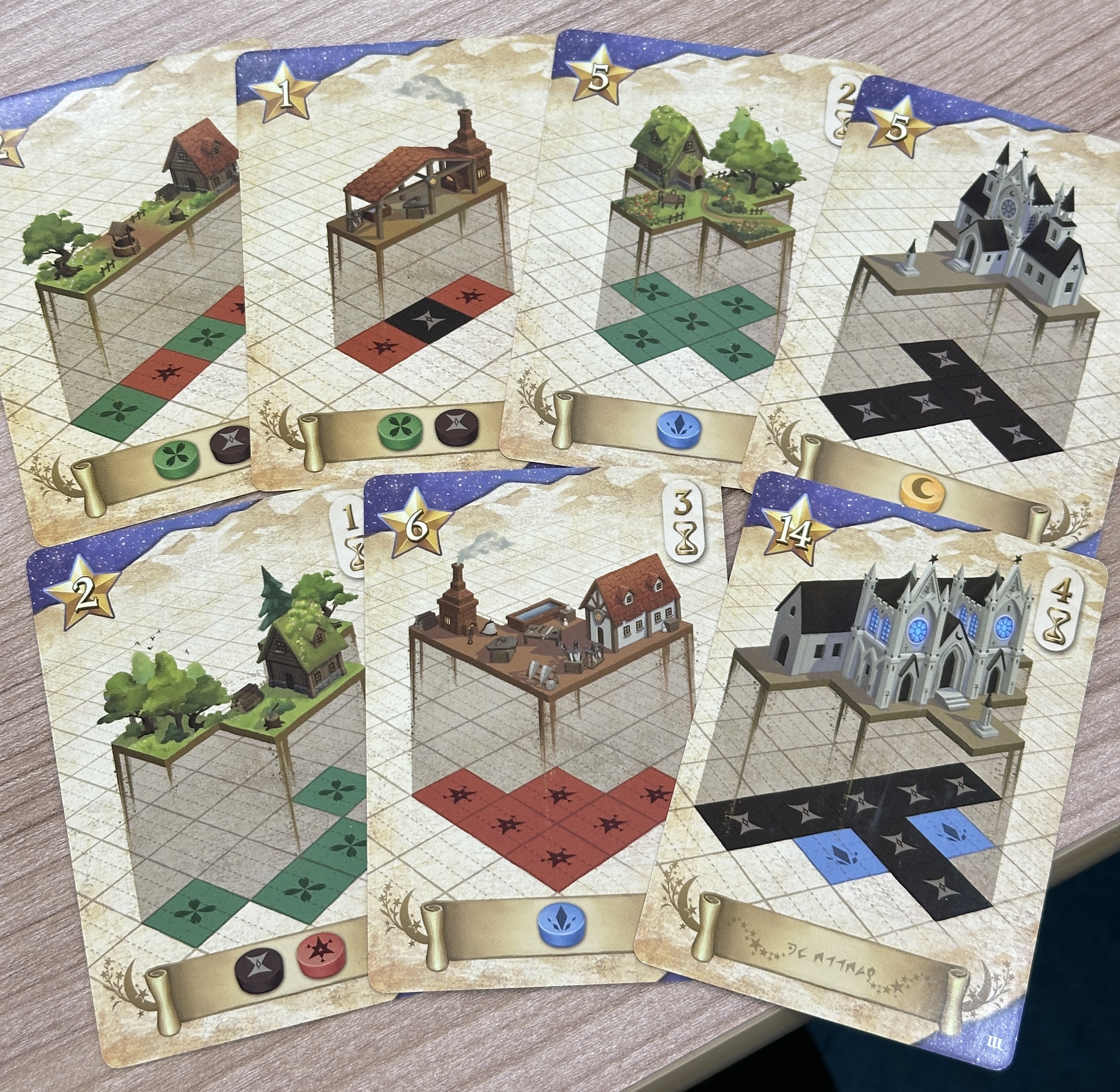 共通の場に並んだ12種のミッションカードから達成しやすそうなものに目星を付けて、その指示通りにタイルを並べたらミッション達成&獲得。ミッションは早い者勝ちで進みます。