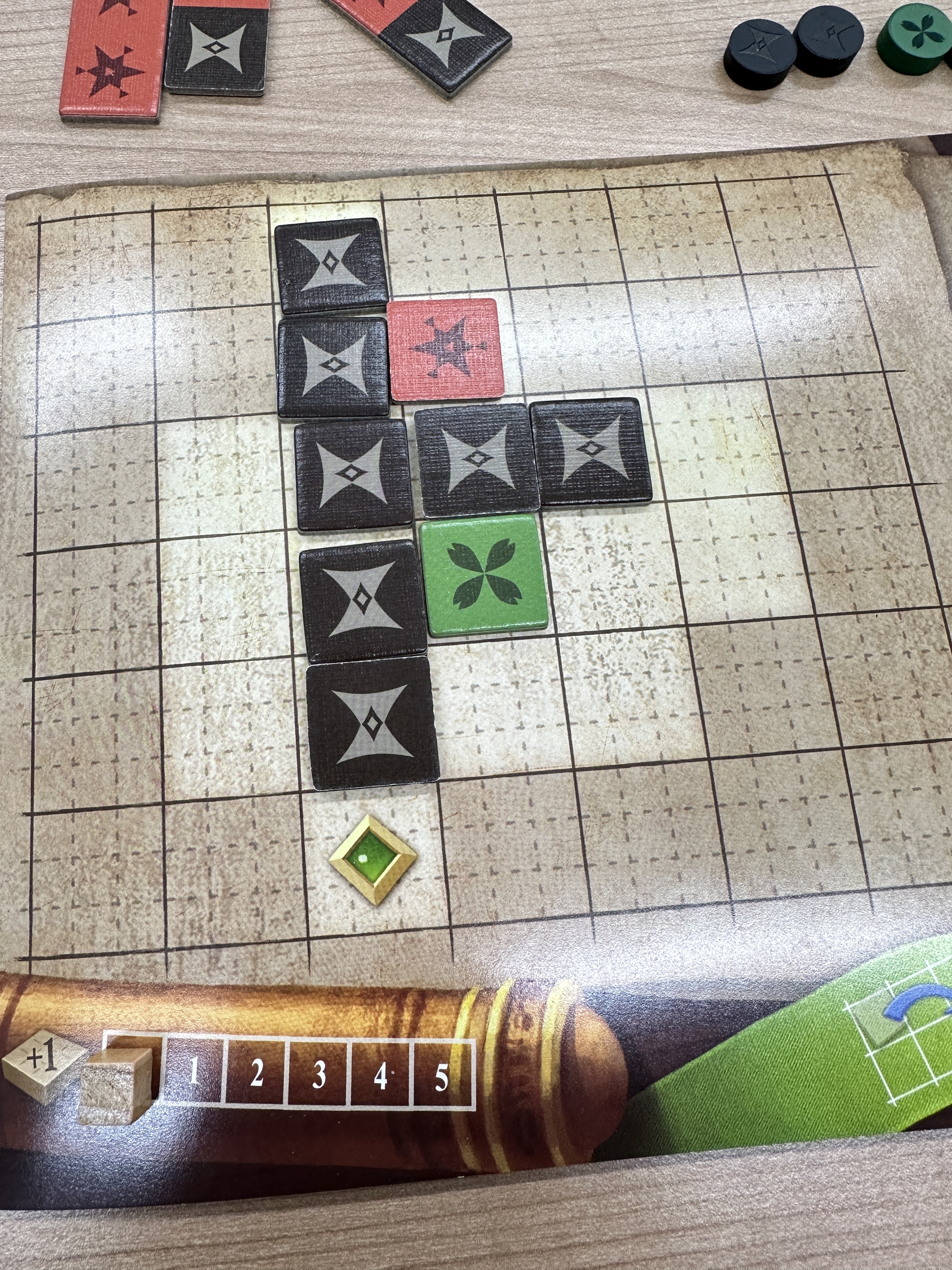 (個人ボードにタイルを置いているところ。ダイヤのマークは個別能力を発動するためのもの。)