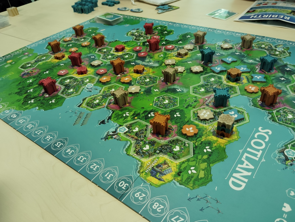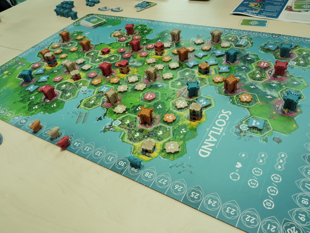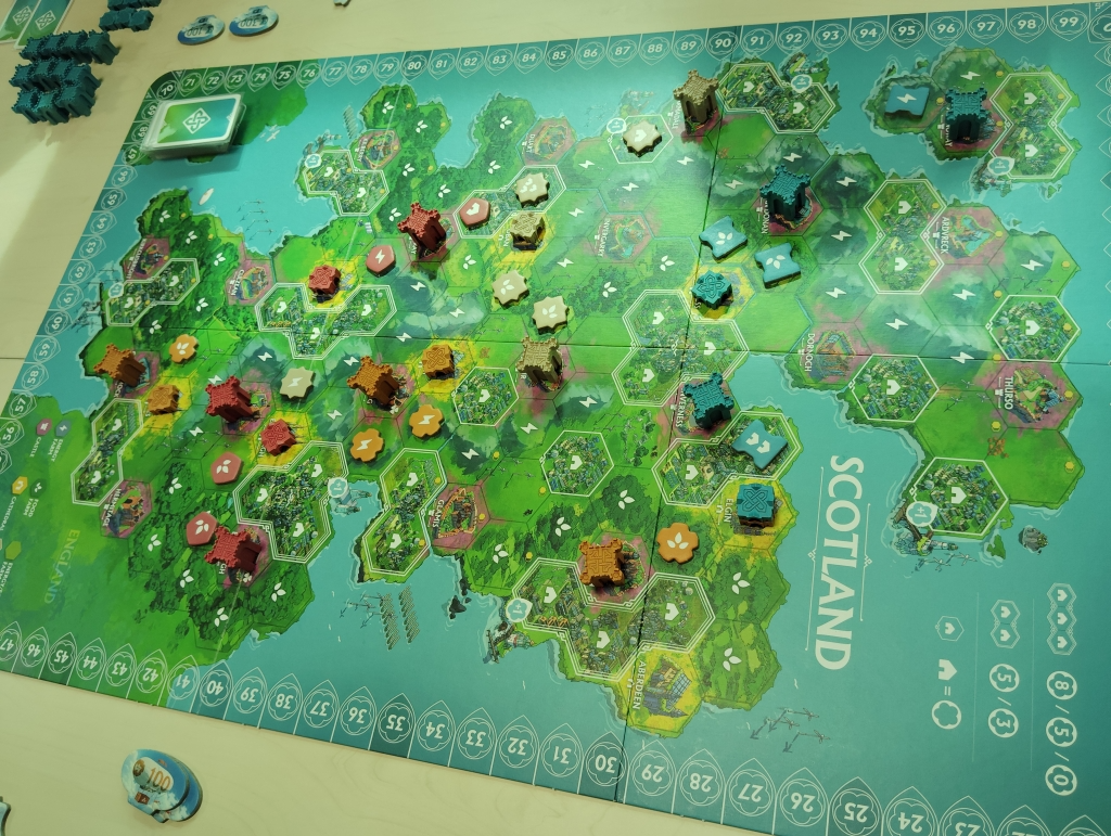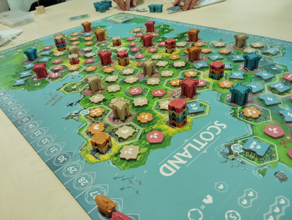袋から引いたチップを対応するマスに配置していき、塔のマジョリティ争いやエリア内でのマジョリティ争い、同種チップによる隣接得点、目標達成得点にと手番でチップ1枚を配置していくだけなのに気づけばプレイヤー同士の絡み合いが強くなり面白さが増していきます。