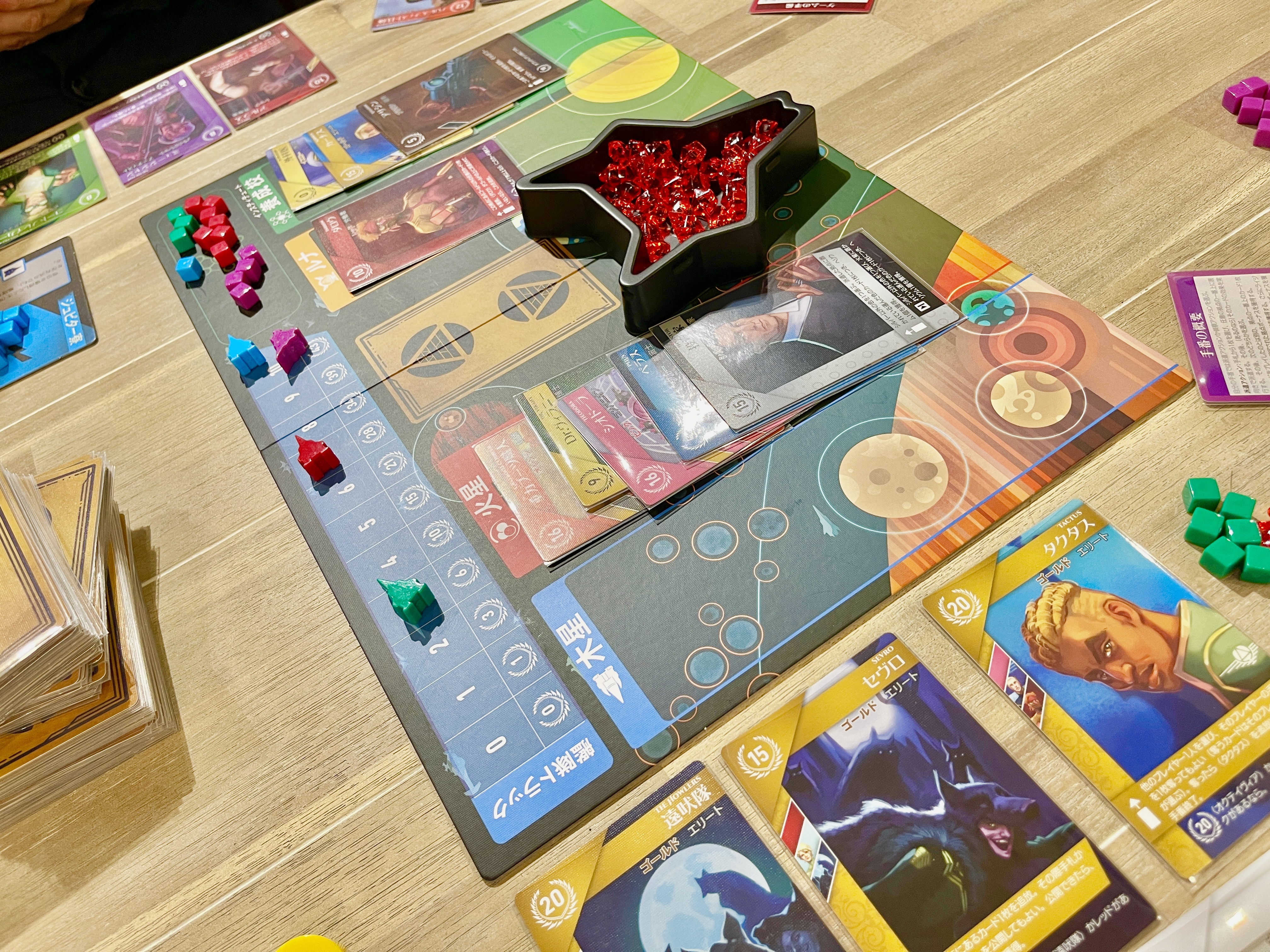 手札のカードを公開し それぞれのカードの基礎点とボーナス点や 資源・トラック・キューブの獲得点を合計して最も得点の高いプレイヤーが勝利します
