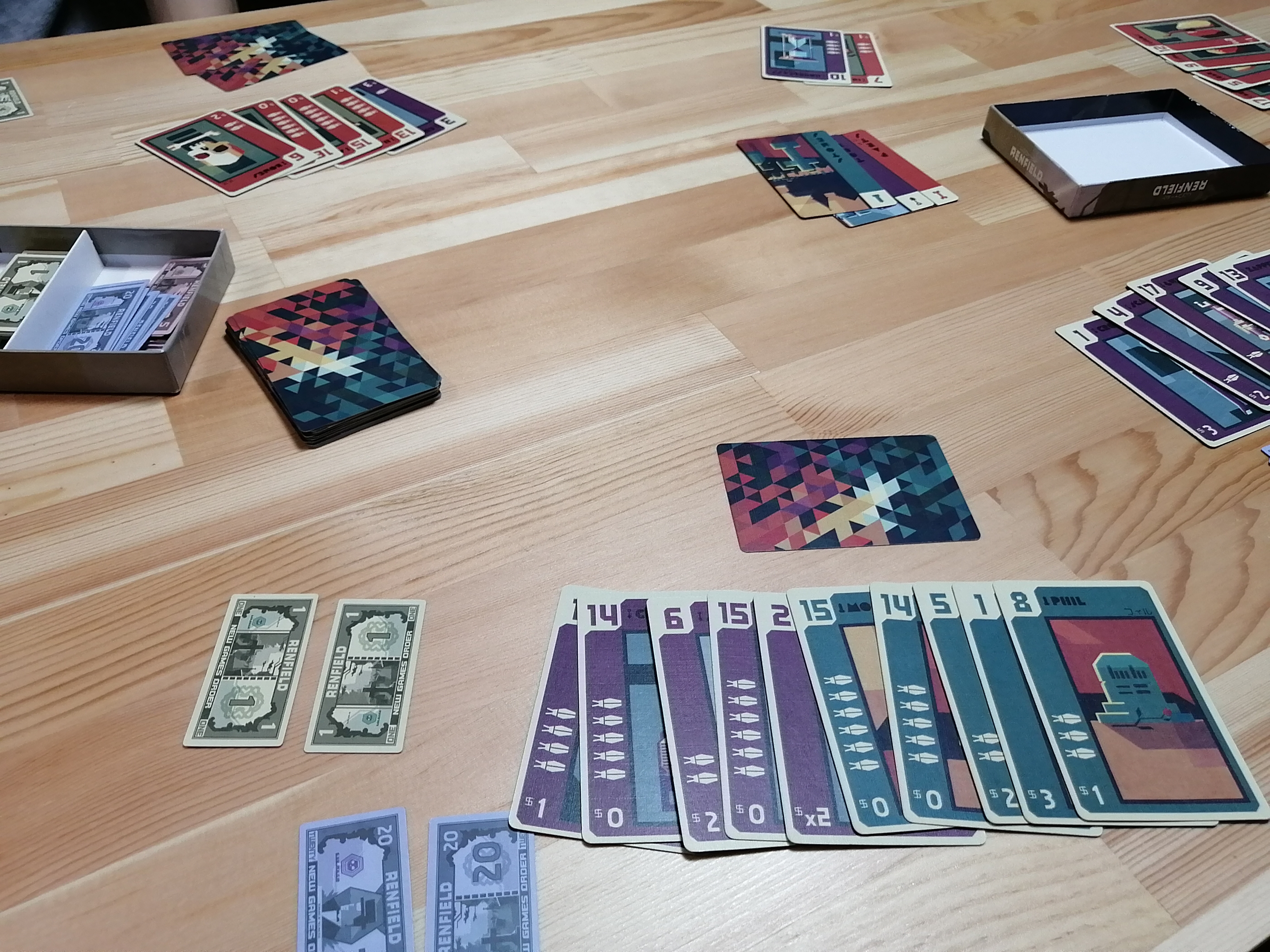 3スート1〜17のカードを使用。マストフォローのトリックテイキングで切り札は無いですが、ラウンド開始時に競りを行い最多入札プレイヤーがラウンドのスートの強さを決めることができます。